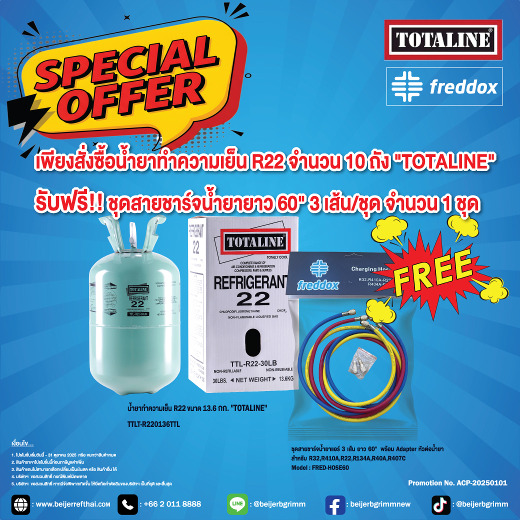 (หมดเขต31ต.ค.68) SPECIAL OFFER ซื้อน้ำยาทำความเย็น R22 TOTALINE ขนาด 13.6 กก. จำนวน 10 ถัง รับฟรีทันที!! ชุดสายชาร์จน้ำยา Freddox